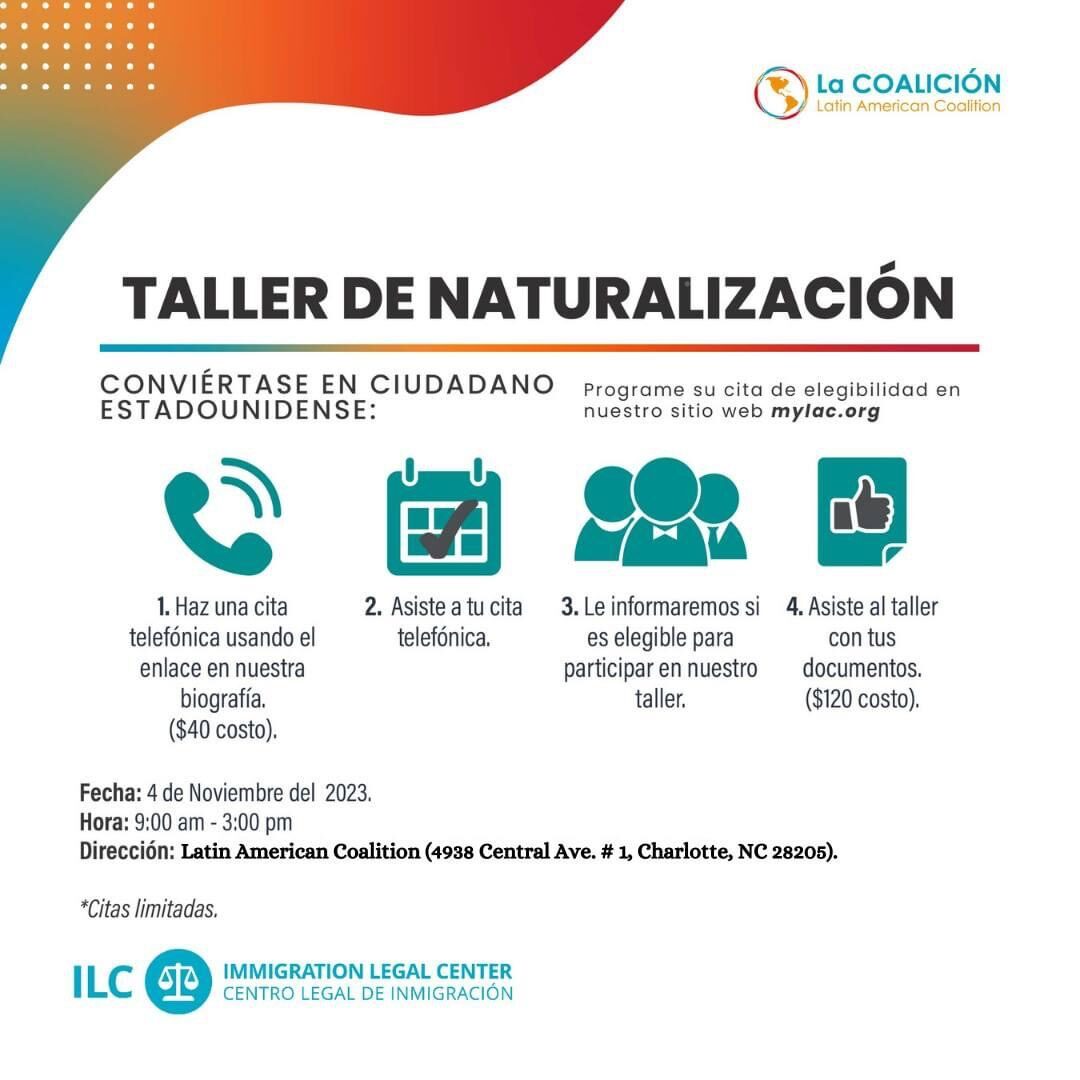 Charlotte – NC. La Coalición Latinoamericana te invita a su próximo taller de naturalización que se efectuará este mes de noviembre, en nuestra sede, donde podrás convertirte en ciudadano americano, … Continue reading LAC te ayuda a obtener la ciudadanía estadounidense