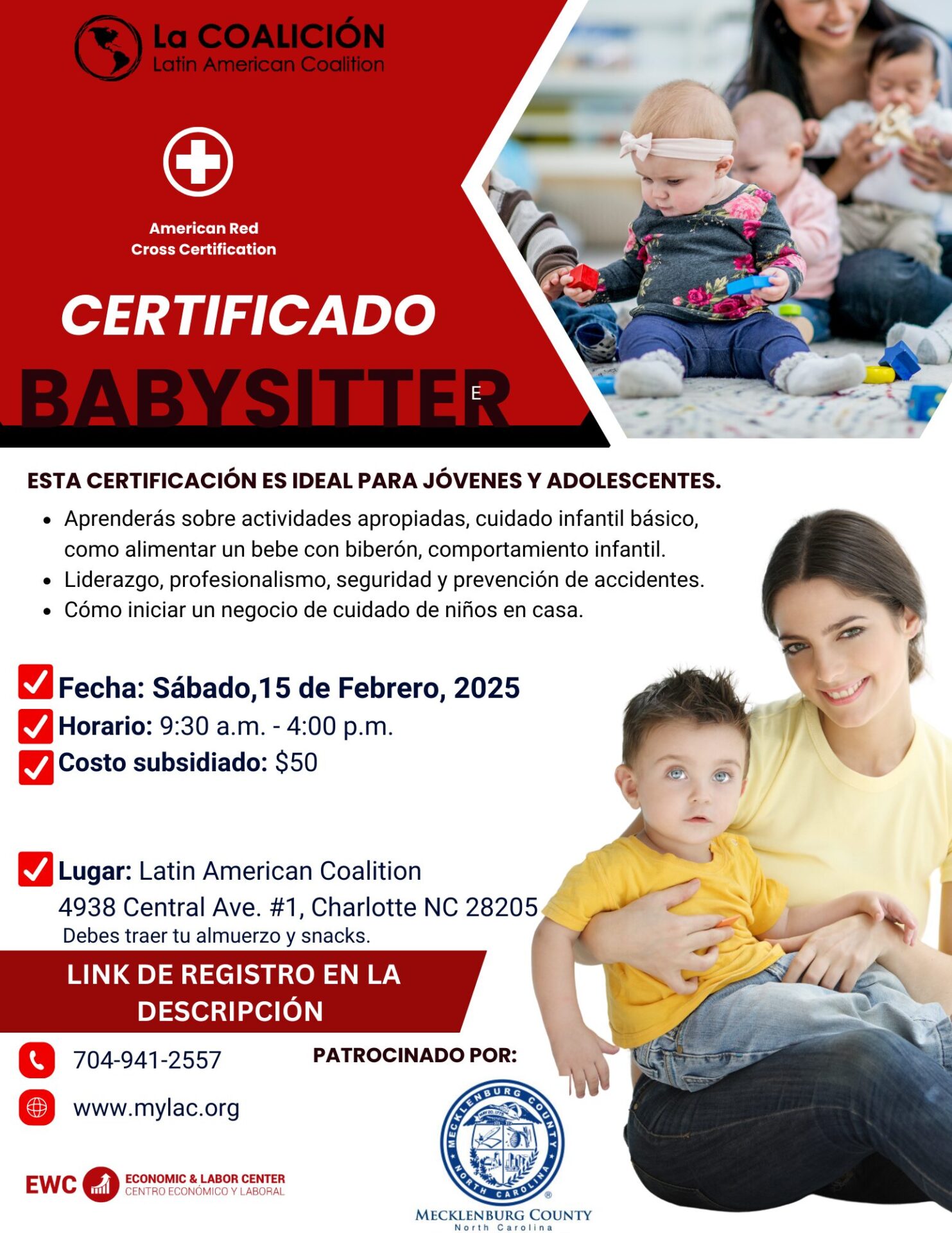 Feb 15 CERTIFICADO BABYSITTER Featured 9:30 AM - 4:00 PM Oficinas de LAC 4938 Central Ave. Suite 101, Charlotte Event Details Get Directions