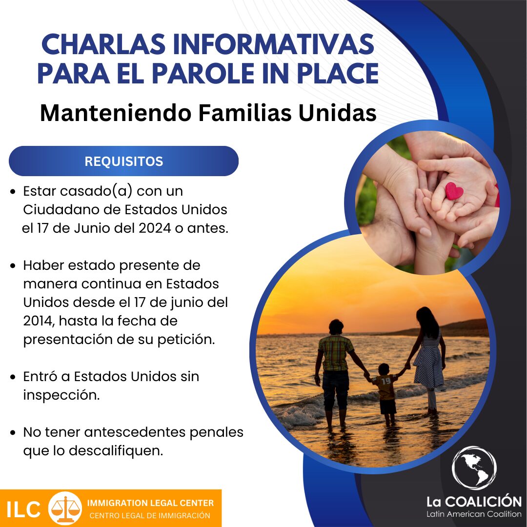 CHARLAS INFORMATIVAS PARA EL PAROLE IN PLACE Manteniendo Familias Unidas Aug 28 CHARLAS INFORMATIVAS PARA EL PAROLE IN PLACE Manteniendo Familias Unidas Featured 6:00 PM - 7:00 PM