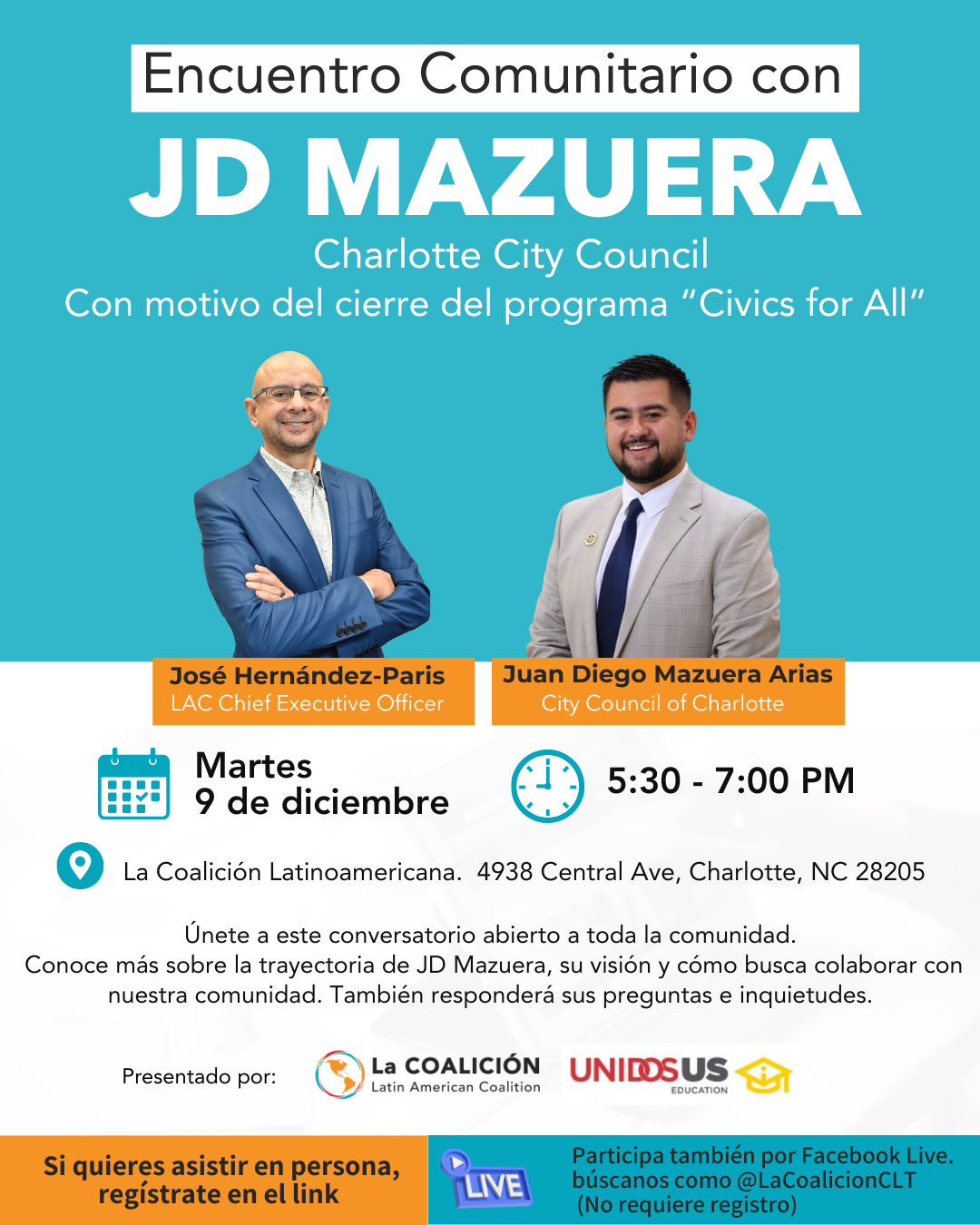 Copy para redes: Encuentro Comunitario con JD Mazuera Con motivo del cierre del programa Civics for All Acompáñanos a este